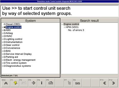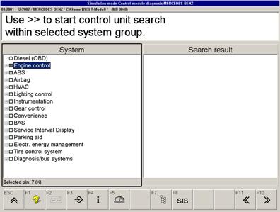 如果名稱(chēng)前面的框有一灰色背景,在此組列出的系統在自動(dòng)組搜索不能發(fā)現。 (通過(guò)點(diǎn)擊加符號或F7可以獲得清單)。如果安裝在車(chē)上的控制單元在組搜索時(shí)不能被找到,相關(guān)的控制單元必須在清單中手動(dòng)選擇。通過(guò)F7, 你可以打開(kāi)或關(guān)閉自動(dòng)選擇。