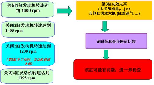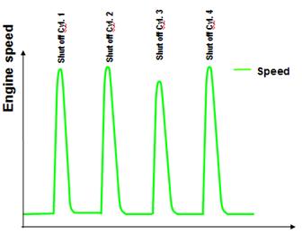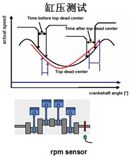 缸壓測試時(shí),ECU停止對發(fā)動(dòng)機的噴油。起動(dòng)機帶動(dòng)發(fā)動(dòng)機運轉。電腦同時(shí)測量各缸壓縮,膨脹階段的轉速。