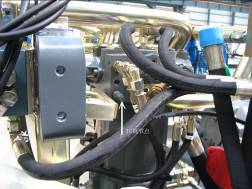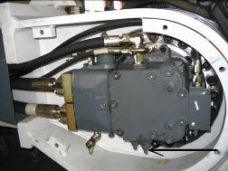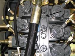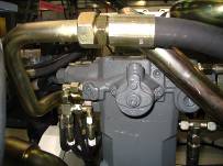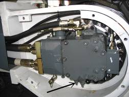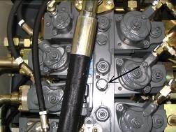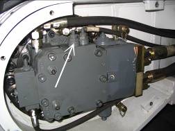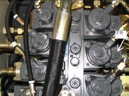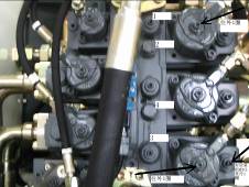 斷開(kāi)回轉馬達制動(dòng)油口,如下圖。在斷開(kāi)的油管上接一測口,在斷開(kāi)的馬達接頭處接堵頭。