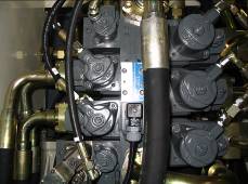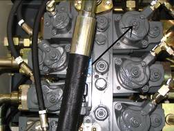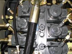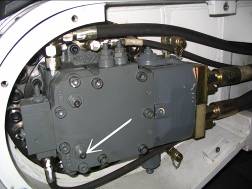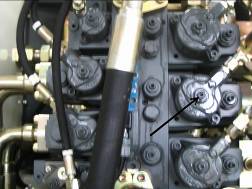 按下控制屏上“F3”鍵,快速回收鏟斗,讀出回油壓力,應為90--100 bar,如果達不到,就調工作閥塊第二個(gè)黑六角螺釘,如下圖。