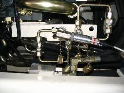 按下控制屏上“F3”鍵,和“兔子開(kāi)關(guān)”按鈕,快速收回斗桿,讀出回油壓力,應為110 bar,如果不對,就調斗桿油缸上的節流閥,使之達到目的100 bar