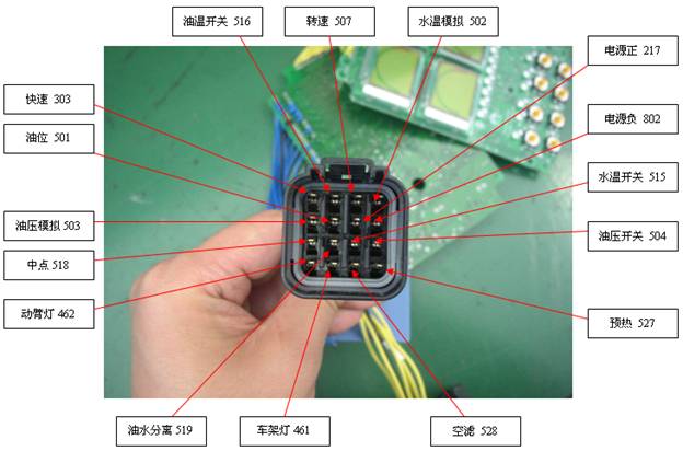 15、按鍵燈光輸出檢測:在儀表上電的情況下,按動(dòng)燈光按鍵一次,儀表如圖1護套(461號線(xiàn))接頭輸出對地12V電壓,燈光相應指示燈點(diǎn)亮;按動(dòng)燈光按鍵二次,儀表如圖護套(462號線(xiàn))接頭輸出對地12V電壓,燈光相應指示燈點(diǎn)亮;按動(dòng)燈光按鍵三次,儀表462號線(xiàn)和461號線(xiàn)接頭均輸出對地12V電壓,燈光兩指示燈同時(shí)點(diǎn)亮,說(shuō)明儀表行走輸出正常。
