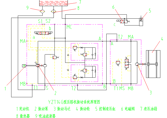 由附圖可知,振動(dòng)泵2把發(fā)動(dòng)機飛輪輸出的機械能轉換成高壓油液的壓力能,再通過(guò)接頭、膠管等輔助元件傳遞給振動(dòng)馬達3;振動(dòng)馬達3把高壓油液的壓力能轉換為機械能,而后通過(guò)聯(lián)軸節驅動(dòng)振動(dòng)軸旋轉,使振動(dòng)輪產(chǎn)生振動(dòng)。通過(guò)控制元件——三位電磁換向排量控制閥a和b的作用,振動(dòng)泵2可以截止或改變高壓油流的方向,從而實(shí)現振動(dòng)馬達停止旋轉或改變其旋向,使振動(dòng)輪停振或實(shí)現大、小振幅的振動(dòng):當電磁閥a和b均不帶電時(shí),振動(dòng)馬達不旋轉,振動(dòng)輪不振動(dòng);當電磁閥a帶電時(shí),振動(dòng)馬達為順時(shí)針?lè )较蛐D(從馬達軸端面看),振動(dòng)輪內大小偏心塊的質(zhì)量偏心矩疊減,變成小振幅振動(dòng)。