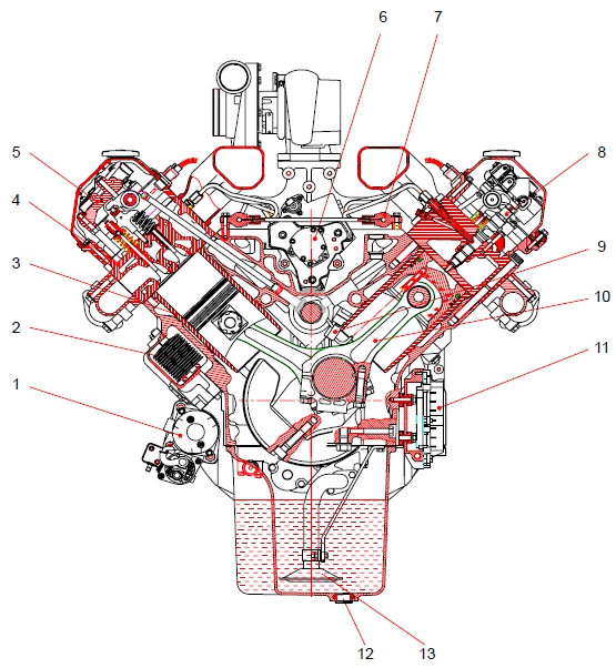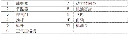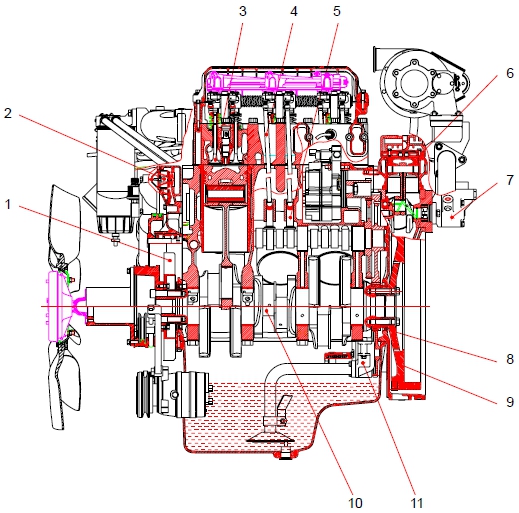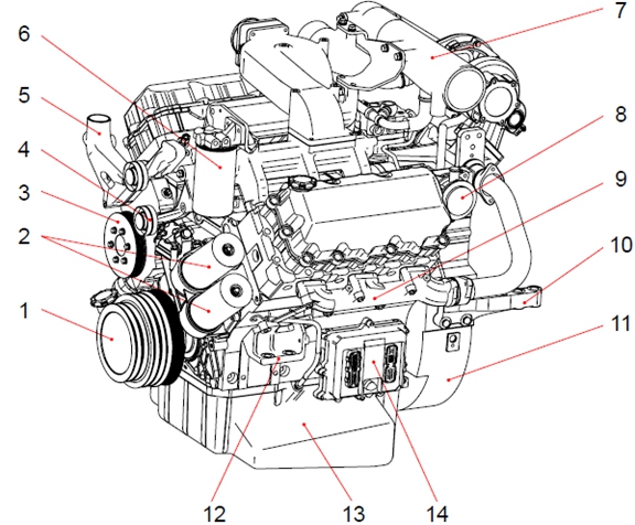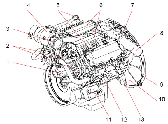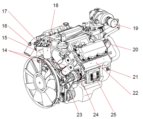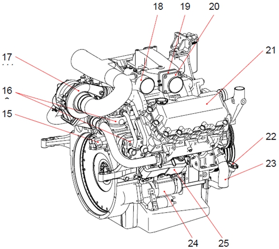 1 曲軸皮帶輪 2 機油濾清器 3 冷卻水泵皮帶輪 4 惰輪 5 冷卻水出口 6 燃油濾清器 7 空氣管 8 呼吸器 9 排氣歧管 10 安裝支架(后) (渦輪增壓器到中冷器) 11 飛輪殼 12 安裝支架(前)  13 油底殼 14 電氣控制裝置(ECU)  15 動(dòng)力轉向泵 16 空氣壓縮機 17 渦輪增壓器 18 空氣管 19 空氣加熱器(空氣濾清器到渦輪增壓器)  20 空氣管  21 氣缸蓋罩  22 加油口蓋   23 冷卻水入口    24 起動(dòng)機  25 機油冷卻器