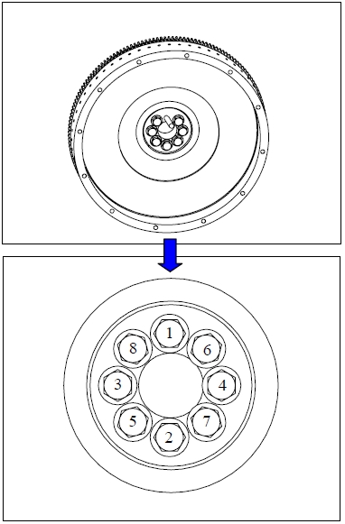 � 將導向銷(xiāo)插入飛輪孔中并暫時(shí)擰緊固定螺栓2∼3 個(gè)螺紋后,按擰緊順序(鋸齒形順序)將其擰緊至規定扭矩。