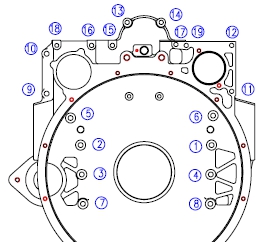 � 在將飛輪殼孔與導向銷(xiāo)配合,并將固定螺栓擰緊2∼3 個(gè)螺紋后,按照擰緊順序(鋸齒方式)擰緊固定螺栓至規定扭矩。