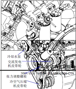 � 進(jìn)行連接時(shí),將皮帶安裝到曲軸皮帶輪、交流發(fā)電機皮帶輪、冷卻水泵和冷空氣壓縮機皮帶輪上。
