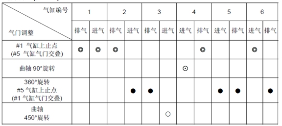 2) 當#1 氣缸處于上止點(diǎn)時(shí),按照下面列表中“◎”調整氣門(mén)間隙。