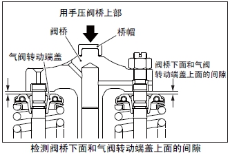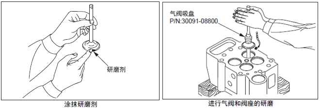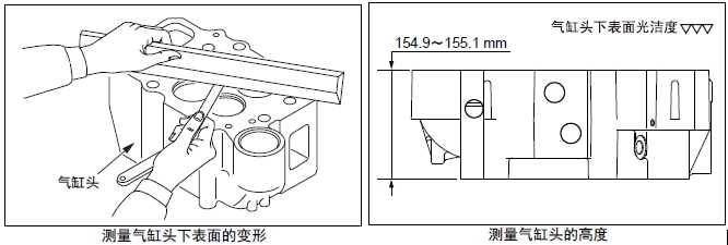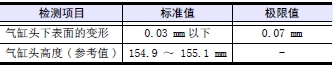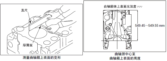 在曲軸箱的上表面放置直尺,用厚薄規測量變形量。超過(guò)極限值時(shí),更換新品或研磨修整。進(jìn)行研磨修整時(shí),要記錄最大研磨量。另外,氣缸頭下面進(jìn)行研磨修整時(shí),合計的最大研磨量限定在0.50 mm以?xún)取?/P>