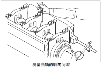 (2) 測量曲柄銷(xiāo)和最后端曲軸頸的軸頸寬度。根據最后端曲軸頸的軸頸寬度的磨損程度使用加大尺寸推力片時(shí),按照加大尺寸推力片的規格研磨曲軸。