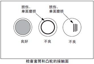 檢查滑動(dòng)面有無(wú)有害的燒損、異常磨耗、異物嵌入或鍍層剝落等。發(fā)現異常時(shí),更換新品。