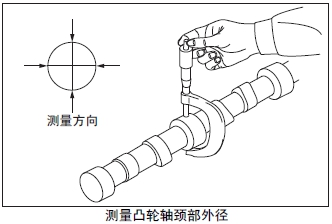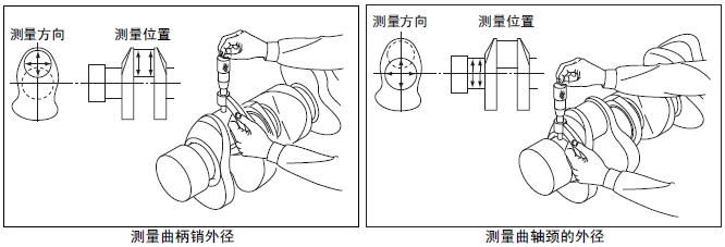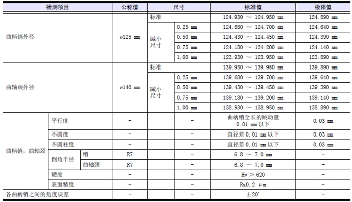 (1) 測量曲軸的曲柄銷(xiāo)和曲軸頸的外徑。超過(guò)極限值時(shí),使用減小尺寸的軸瓦,按照和減小尺寸軸瓦的規格研磨曲軸。使用-1.00 mm 規格的減小尺寸主軸瓦仍然超出極限值時(shí),更換新的曲軸。
