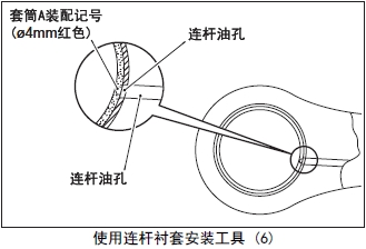 (1) 將新的連桿襯套的油孔對準套筒A的裝配記號(ømm 紅色)裝在套筒A上。