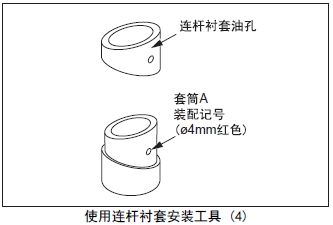 (3) 連桿襯套外周涂敷潤滑油,套筒A,B的裝配記號(紅色刻線(xiàn))對準,使連桿襯套的油孔和連桿的油孔一致,用壓力機壓入。