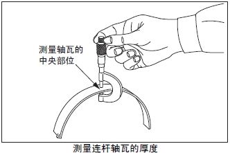 測量連桿軸瓦的中央部位的厚度。超過(guò)極限值時(shí),將軸瓦上下整套更換。根據曲柄銷(xiāo)的磨損程度,在曲軸重新研磨使用時(shí),使用減小尺寸的軸瓦。曲軸的研磨要領(lǐng)參考「發(fā)動(dòng)機本體的檢測、修理」的「曲軸的曲柄銷(xiāo)和曲軸頸的研磨」項。