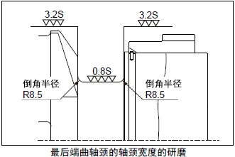 注意研磨時(shí)不要改變軸頸端部倒角的半徑。對于表面硬度明顯降低的曲軸,要再進(jìn)行熱處理并進(jìn)行磁性探傷檢查。研磨加工后的表面精度均應滿(mǎn)足標準值要求。