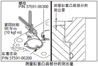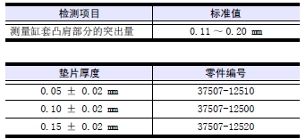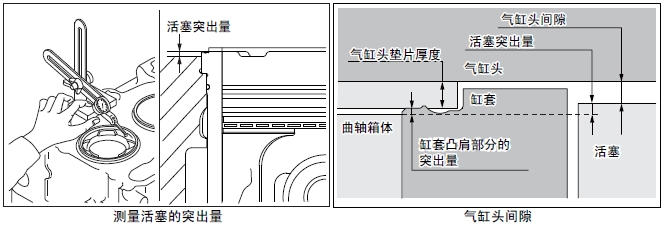 注: 從活塞突出量、缸套凸肩部的突出量、氣缸墊片的厚度,可判斷氣缸頭間隙(活塞頂部和氣缸頭之間的間隙)。氣缸頭間隙=氣缸頭墊片的厚度+ 缸套凸肩部的突出量-活塞突出量