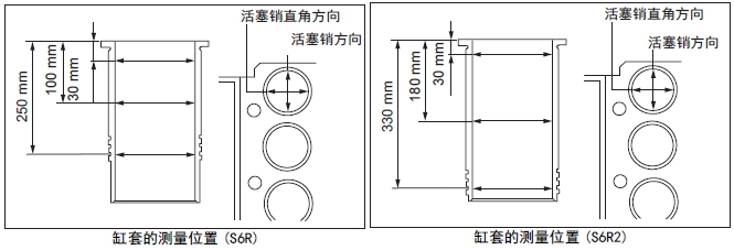 2.5 測量三菱發(fā)動(dòng)機缸套的內徑選擇缸套內側的上部( 上死點(diǎn)時(shí)No.1 氣環(huán)的位置)、中間部分和O形圈插入部分,沿活塞銷(xiāo)方向及其直角方向,測量缸套的內徑。超過(guò)極限值時(shí)更換新的缸套。發(fā)生變形時(shí)重新安裝。