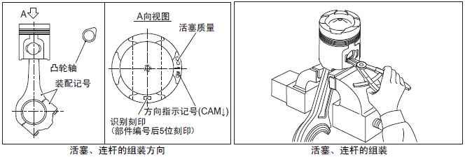 (1) 活塞銷(xiāo)涂抹潤滑油后插入,將活塞和連桿組裝在一起?;钊瓦B桿的組裝方向如圖所示。