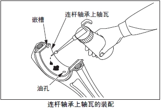 將連桿上軸瓦和連桿大端的嵌槽對準后插入,軸瓦的內表面涂抹潤滑油。這時(shí),要確認連桿的油孔和軸瓦的油孔一致。