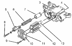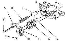 使用清潔的發(fā)動(dòng)機機油潤滑惰齒輪和驅動(dòng)齒輪。 使用清潔的發(fā)動(dòng)機機油潤滑套筒軸承 (4) 。 將惰齒輪 (12) 和驅動(dòng)齒輪 (13) 安裝到泵體 (3) 中。