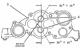 使用工具 (B) ,將套筒軸承 (4) 安裝到泵體 (3) 中。 軸承接頭應距兩個(gè)軸承孔中心線(xiàn) 30 ± 15 度。 安裝套筒軸承,使套筒軸承與泵體的外側齊平。