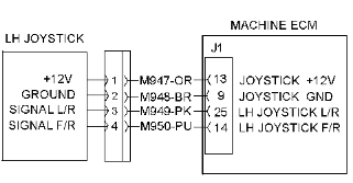 將萬(wàn)用表表筆引線(xiàn)插入左手操縱手柄控制傳感器接頭的背面,并測量觸點(diǎn) 1(M947-OR)和觸點(diǎn) 2(M948-BR)間的電壓。