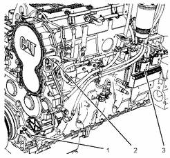 發(fā)動(dòng)機左視圖(典型示例) (1) 主轉速 / 正時(shí)傳感器接頭 (2) 輔助轉速 / 正時(shí)傳感器接頭 (3) P2 ECM 接頭 |