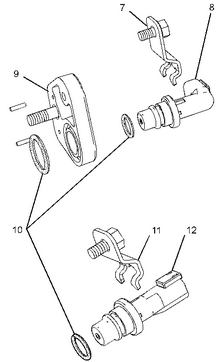 發(fā)動(dòng)機速度 / 正時(shí)傳感器 (7) 支架 (8) 輔助發(fā)動(dòng)機轉速 / 正時(shí)傳感器 (9) 安裝板 (10) O 形密封圈 (11) 支架 (12) 主轉速 / 正時(shí)傳感器 |