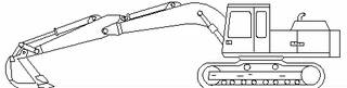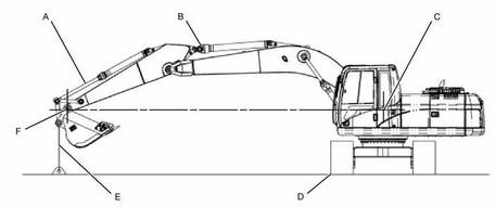機器的基本位置 (A)鏟斗油缸完全伸出 (B)斗桿油缸完全收回 (C)動(dòng)臂座架中銷(xiāo)的位置 (D)履帶位置 (E)鏟斗的固定位置 (F)斗桿鼻端中銷(xiāo)的位置 |
