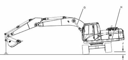 測量泵壓力時(shí)機器的位置 (G)動(dòng)臂油缸的伸出部分 (H)后側或機器的履帶 (J)履帶與地面之間的空隙 |