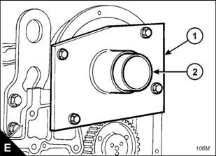 2  Fit the camshaft guide (E), GE5007, to the gear case cover, but do not tighten the bolts fully.