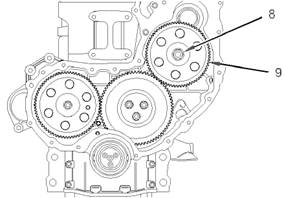 2.松開(kāi)鎖緊螺釘(1)。轉動(dòng)隔套(2),以便將鎖緊螺釘(1)擰緊抵到噴油泵的軸上。逆時(shí)針?lè )较蜣D動(dòng)噴油泵齒輪來(lái)消除齒隙。將鎖緊螺釘(1)擰緊至扭矩13N·m(9.6lbft)。
