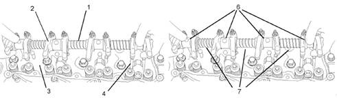 2.如果解體過(guò)搖臂軸組件,將27610227搖臂組裝工具(6)固定在搖臂(2)外周,以輕微壓縮彈簧(7)。在重新組裝期間,搖臂(2)必須保持遠離缸蓋(3)的機加工面。