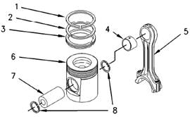 1.用一個(gè)合適的活塞環(huán)擴張器從活塞(6)上拆下活塞環(huán)(1)和(2)及控油環(huán)(3)。從連桿蓋上拆下連桿下軸瓦。從連桿上拆下連桿軸承上軸瓦。