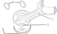 3.將連桿的標記(1)與活塞的凸臺切口(2)對齊。還要檢查確認活塞頂部標記的箭頭(3)對齊。將活塞銷(xiāo)安裝到活塞中并穿過(guò)連桿。