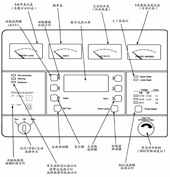 康明斯柴油發(fā)電機組PCC3100發(fā)電機組前端面板功能介紹