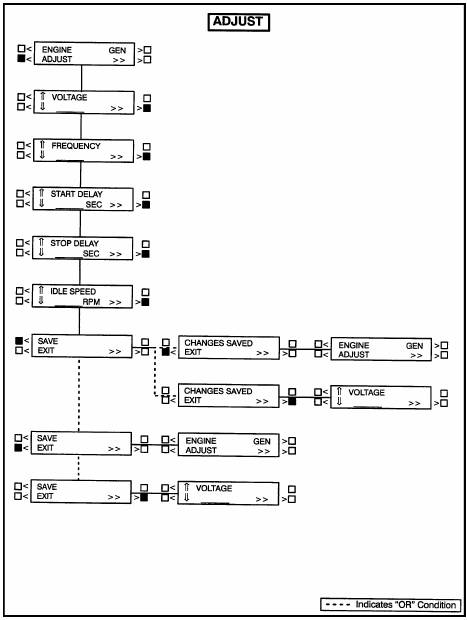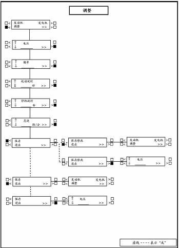 調整(ADJUST)子功能允許對發(fā)電機組輸出電壓、頻率、起動(dòng)和停機延時(shí)進(jìn)行調整。