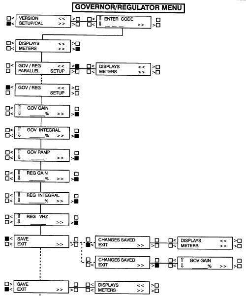 下一頁(yè)為調速器/調壓器(GOV/REG)子功能的方框圖,這是4項設定/標定(SETUP/CAL)功能中的第3項子功能。如果按主功能中“>>”符號旁邊的按鍵,將顯示版本/設定/標定(VERSION/SETUP/CAL)子功能。