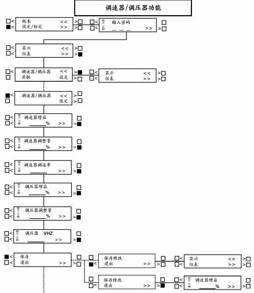按“⇑”和“⇓”符號旁邊的按鍵以調整調速器/調壓器參數,按“>>”符號旁邊的按鍵,進(jìn)到下一功能。