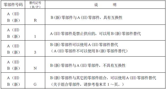 圖解中表示了基準號碼?;鶞侍柎a表示3~4位時(shí),前面的1~2位相對于此組裝零部件的基準號碼,后面的2位,原則上,是每個(gè)構成零部件的補充號碼。(3) 零件編號記載著(zhù)可以供應的原廠(chǎng)純正零部件的號碼。