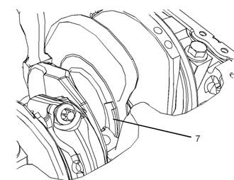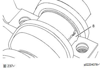 4對于6號主軸瓦,確保兩個(gè)止推墊圈(7)清潔且無(wú)磨損或損壞。如有必要,更換止推墊圈。使用清潔的發(fā)動(dòng)機機油潤滑止推墊圈(7)。將止推墊圈(7)在曲軸與缸體之間滑動(dòng)到位。確保定位凸舌正確座入缸體。