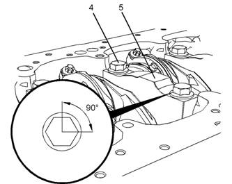 7.使用清潔的發(fā)動(dòng)機機油潤滑螺栓(4)的螺紋。使用清潔的發(fā)動(dòng)機機油潤滑螺栓(4)的端部底面。