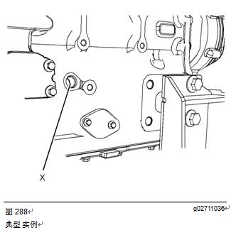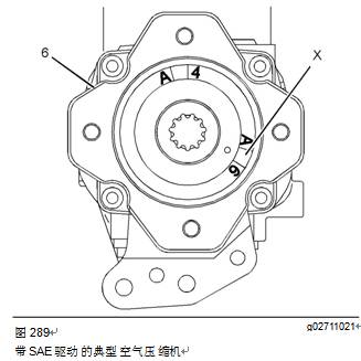 注:確保正時(shí)標記(X)與正時(shí)標記A6對齊。有關(guān)帶SAE驅動(dòng)的空氣壓縮機,請參閱圖289。有關(guān)帶DIN驅動(dòng)的空氣壓縮機,請參閱圖290。