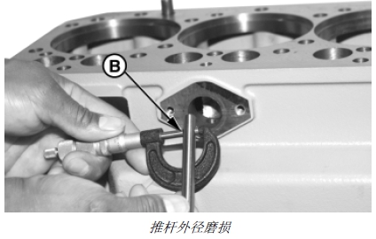 2. 測量推桿外徑 (B)。如果推桿外徑小于技術(shù)規格,應安裝新推桿。