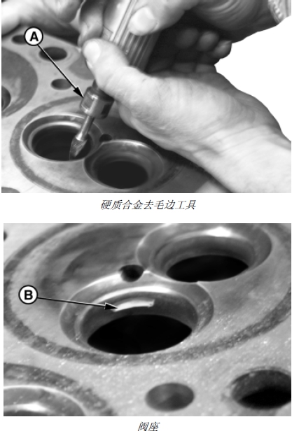 1. 用硬質(zhì)合金去毛邊工具 (A) 提起閥門(mén)座鑲圈底部的毛邊 (B)。