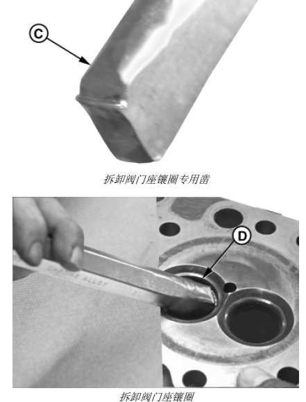 2. 用紙板或棉布保護缸蓋表面。用錘子敲打用專(zhuān)用圓頭鑿(C) 的手柄,直到閥門(mén)座鑲圈(D) 松動(dòng)。