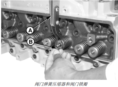 5. 用 JDE138 閥門(mén)彈簧壓縮器 (A) 壓縮閥門(mén)彈簧,并在閥桿上安裝閥門(mén)鎖瓣 (B)。