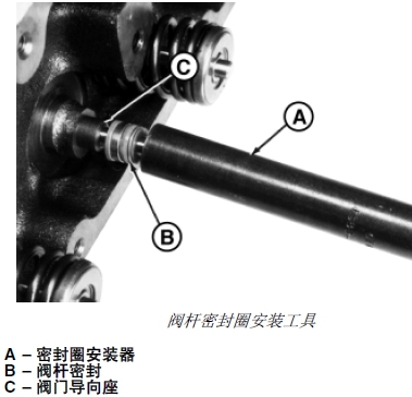 3. 用 JDG678 閥桿密封圈安裝器 (A) 將閥桿密封圈 (B)滑入閥桿內,套在閥門(mén)導向座 (C) 上。