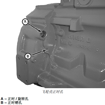 2. 拆下John Deere約翰迪爾強鹿柴油發(fā)動(dòng)機正時(shí)/ 旋轉孔 (A) 和正時(shí)銷(xiāo)孔 (B) 上的塑料塞或蓋板。